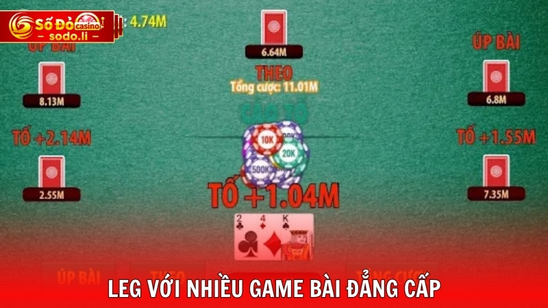 Sảnh game bài SODO LEG là nơi quy tụ nhiều cao thủ nhất tại nhà cái. Chắc chắn khách hàng sẽ khó lòng rời mắt khỏi những bàn cược được đầu tư vô cùng chuyên nghiệp và sang trọng. Đồng thời cũng không thể cưỡng nổi sức hấp dẫn của những sự kiện tặng thưởng miễn phí mà sân chơi tổ chức.
