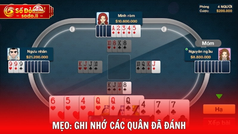 Được xem là một chiến thuật quốc dân và được sử dụng nhiều nhất trong game bài SODO tại đây bạn chỉ cần ghi nhớ các quân đã được đánh ra để dự đoán họ đang nắm giữ những quân nào. Hơn hết bạn phải đưa ra phán đoán phỏm của đối thủ, nếu thấy người chơi đó không đánh các lá nhỏ có thể họ đang giữ các cặp để chủng bị một nước Ù. Vì thế hãy xác định các quân có nguy cơ bị ăn. Một bí quyết mà chúng tôi muốn chia sẻ với bạn đó là nếu đối thủ vừa bốc từ nọc mà đánh ra ngay thì chắc chắn quân đó không liên quan đến bài của họ.